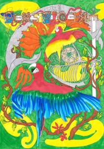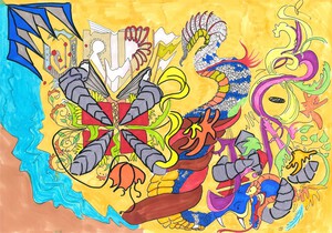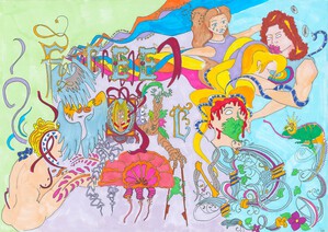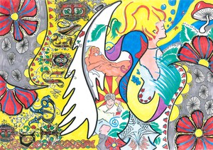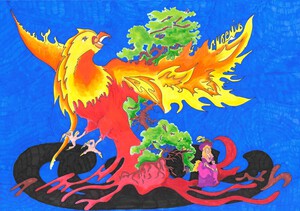 This artwork symbolizes the power of resilience in life. The tree represents life, the phoenix represents rising from dark periods. The dark period is represented with black at the bottom of the drawing. The relationship of man and the phoenix symbolizes the degree of strength.