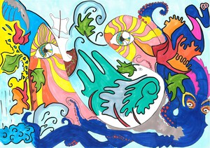 When you turn the painting a quarter turn you see a gladiator. That means when you look at a situation in a different way, you can also highlight different/more things. Birds represent freedom and the gladiator represents strength and perseverance.